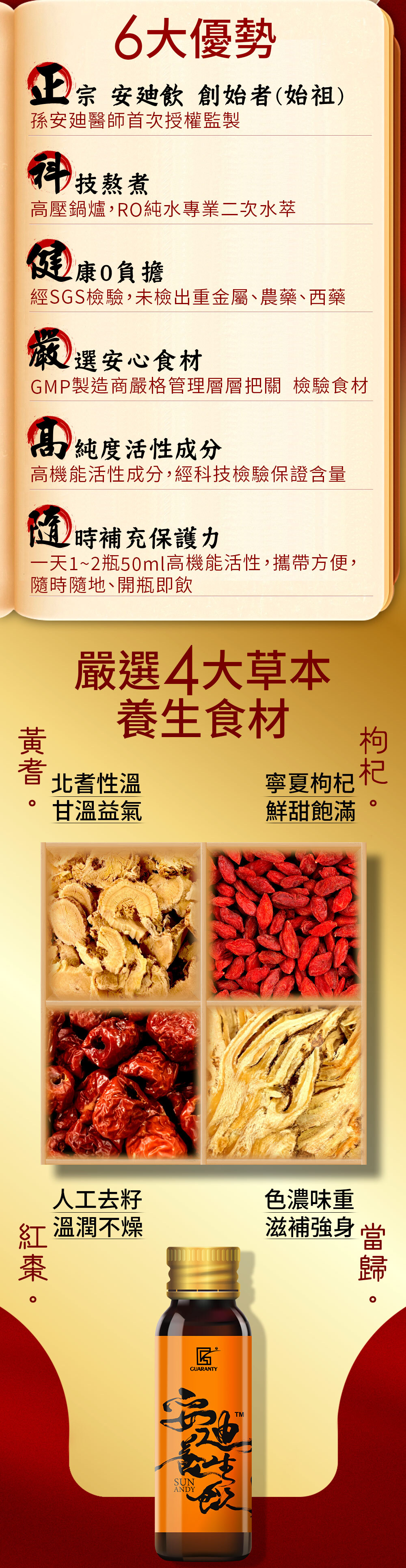 ▶由孫安廸醫師專精多年研究出的黃金比例:黃耆、枸杞、紅棗、當歸。